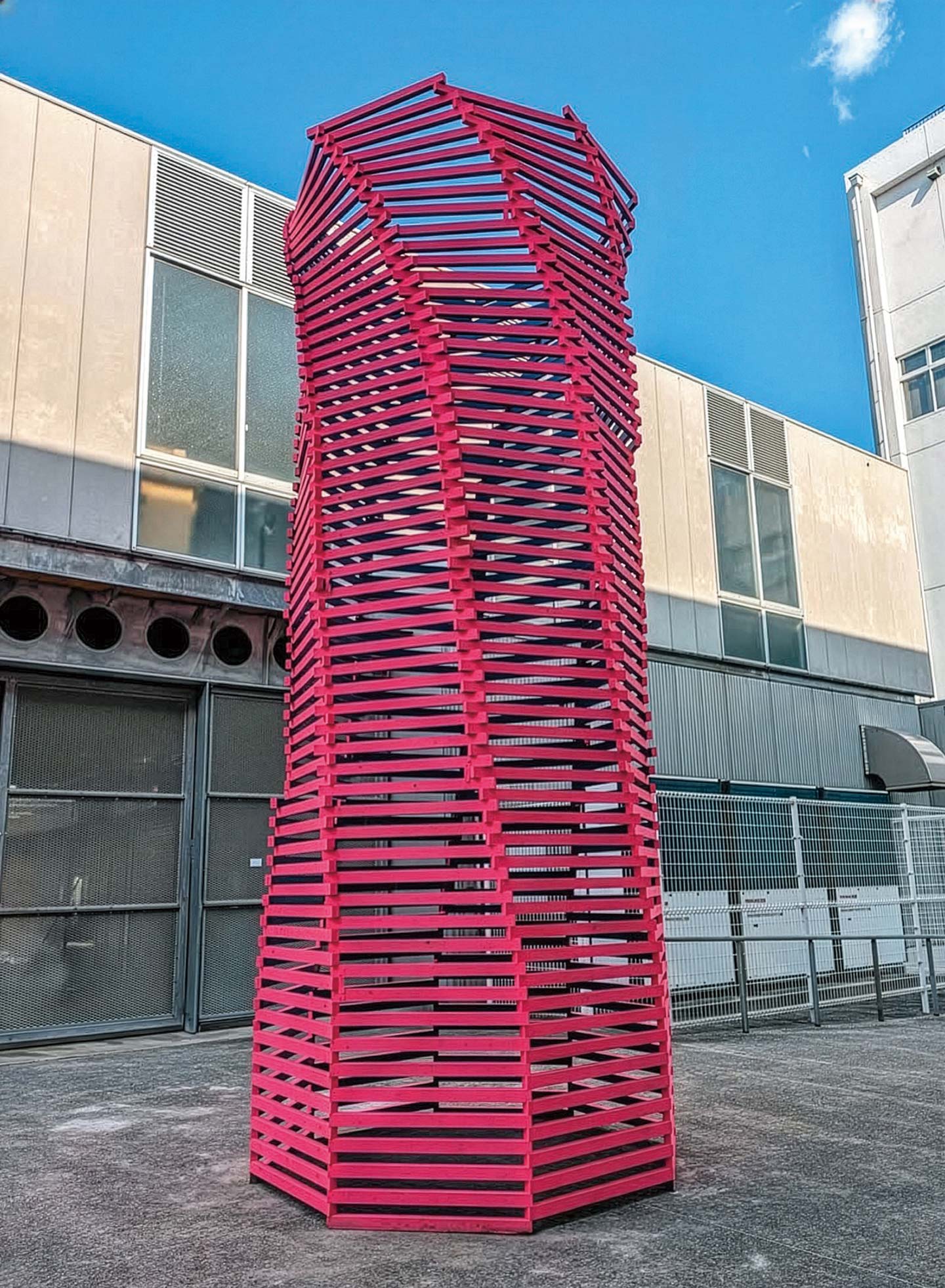 人間の視覚にフォーカスし「見えそうで見えない」という、人間が一度は経験のある感覚をコンセプトに落とし込み作品を通して表現した。内側と外側、二色の間のスリット状からなる八角柱は見る場所によっては違う見え方になり、錯視のような感覚を与える。
