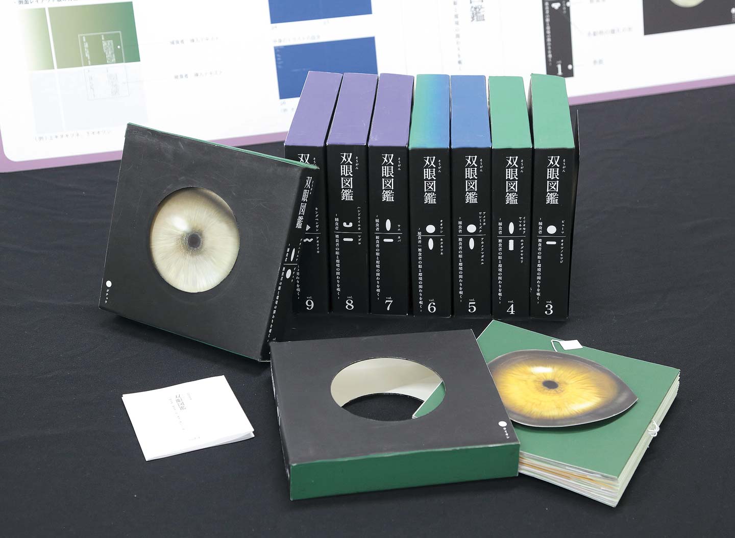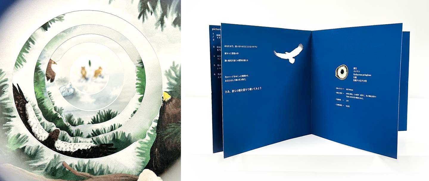 眼はただ見るための器官ではなく、生き方そのものが現れている。本作品は、動物の眼の形と環境の関わりを、捕食者と被食者という二つの立場から構成した、覗きからくり形式の図鑑全9巻である。瞳孔の形をした覗き穴からその動物の生きている環境が見えてくる。眼を見ることは、生き方を見ることに繋がるのだ。
