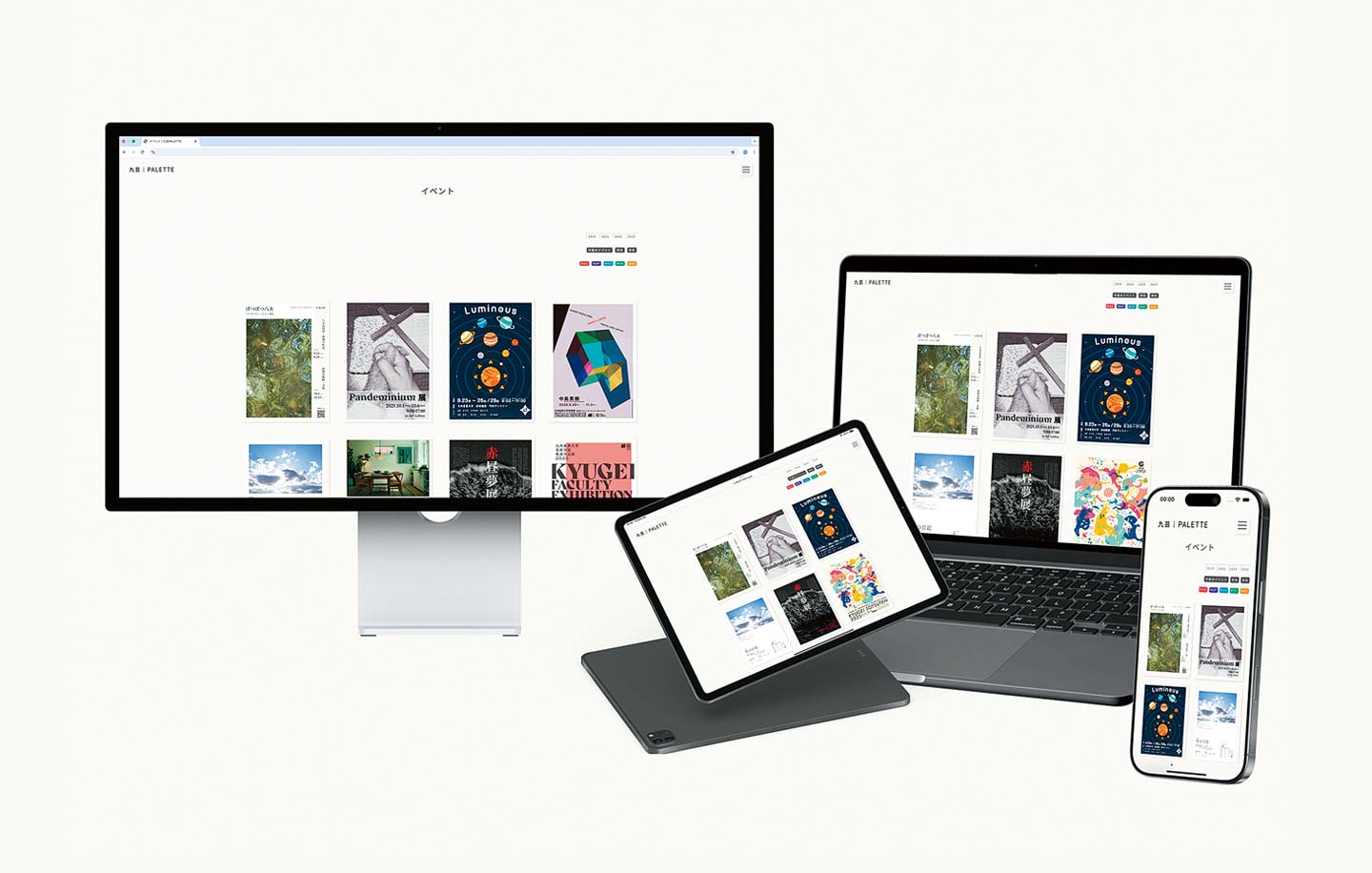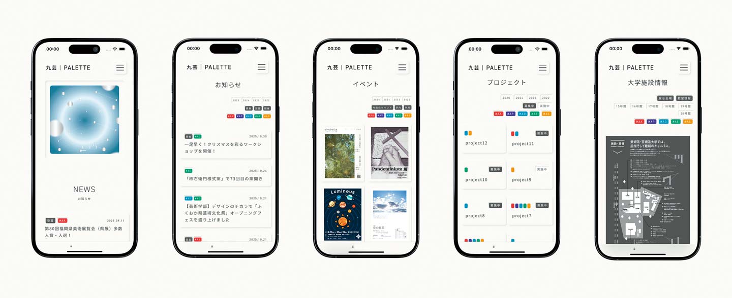 九州産業大学芸術学部に関わる人が、情報を共有し連携できるWebサイトです。このWebサイトを通じて、学科・専攻・学年といった枠を超えた連携を活性化させ、学部全体の活動を広く伝え合うことを目的としています。長期的な運用のための仕組み作りや、情報が見つけやすく見やすいサイト構成を意識して制作を進めました。