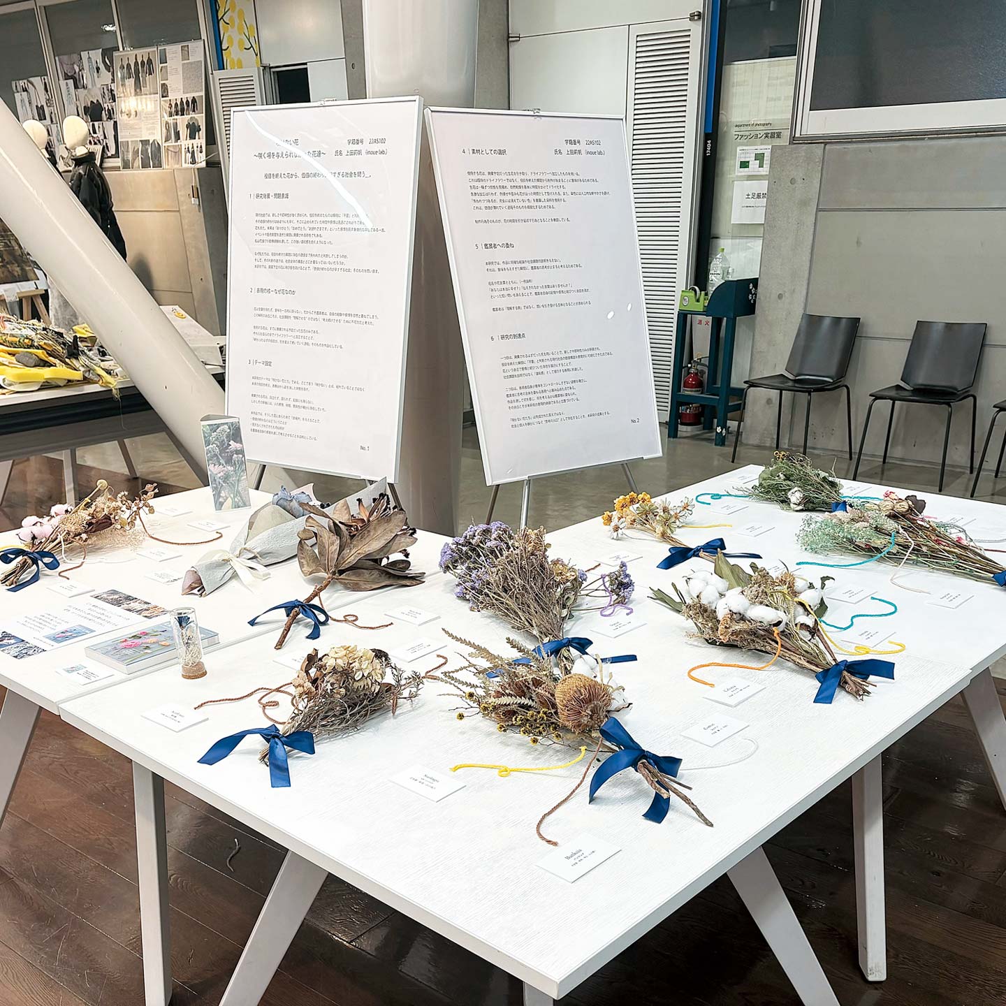 廃棄予定の生花を「咲けない花」として展示した研究です。咲く場を与えられなかった存在として捉え、役目を終えた存在が見えにくいという社会構造に着目します。鑑賞者には意味を固定せず、問いのまま受け取り持ち帰ってほしいと考えています。咲くことだけが価値ではないという視点を静かに提示します。